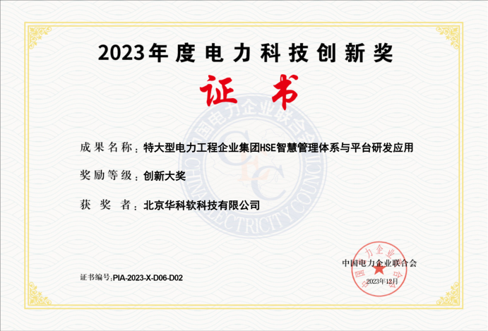 近日,中国电力企业联合会公示了2023年度电力创新奖获奖名单。华科软公司承建的项目《特大型电力工程企业集团HSE智慧管理体系与平台研发应用》斩获最高奖项——创新大奖。